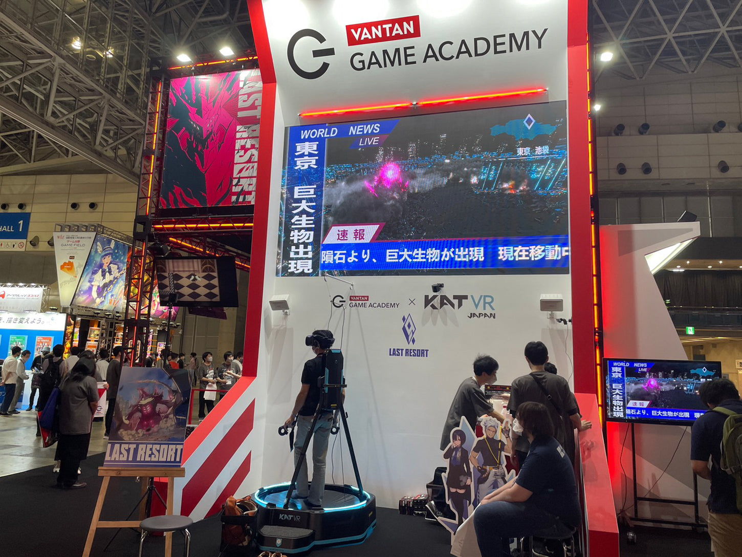 「バンタンゲームアカデミー」東京校の生徒が制作した「LAST RESORT」(ラストリゾート)という、歩行型 VR デバイス「KATWALK mini S」を使った、実際に走ったり撃ったり出来る究極の体験型ゲームにおいて、「今までにない体験を創りたい!届けたい!」という生徒達の想いに応えるべく、実機の提供及び、ゲームを KATWALK に実装するにあたっての実作業面でのサポートを行いました。また、展示会においても、生徒のゲーム作品の発表が万全に行なえるよう設営やアテンドの面での支援を行っています。