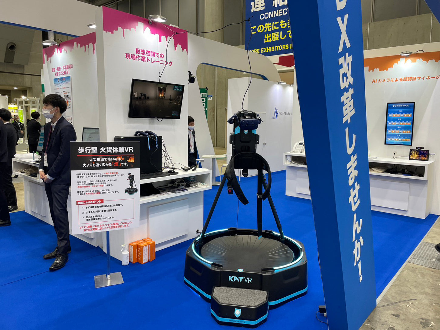 株式会社理経様よりコンテンツ提供をいただき、KATVRによるビル火災避難VRを体験展示して頂きました。実際に歩いて避難を行う内容の為、訓練としては最適です。