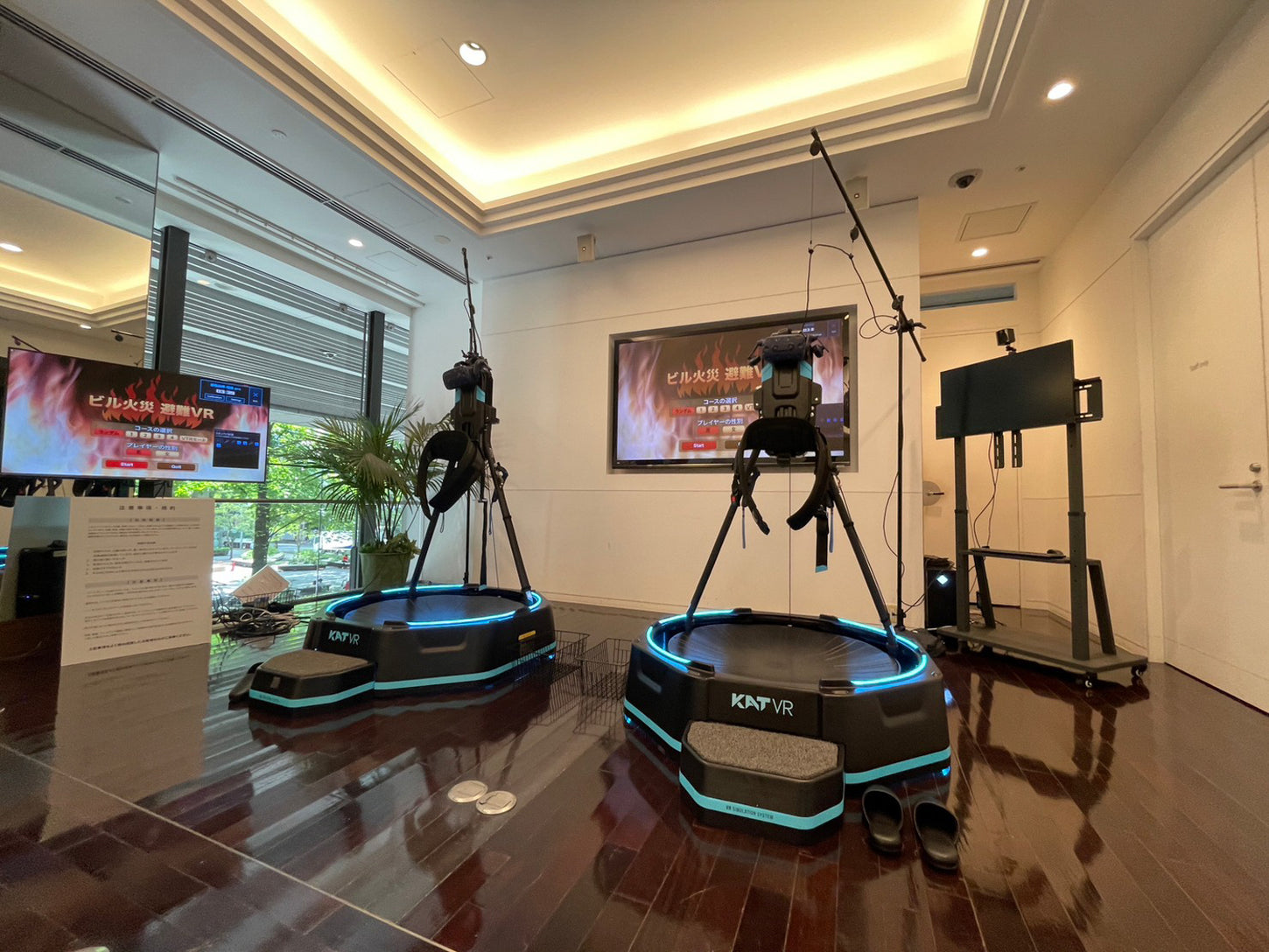 株式会社理経様制作のVR防災体験ソフトウェア「ビル火災避難VR」による4日間に渡る社内防災訓練向けのKATWALKのレンタル利用。運用サポートも併せて行わせて頂きました。